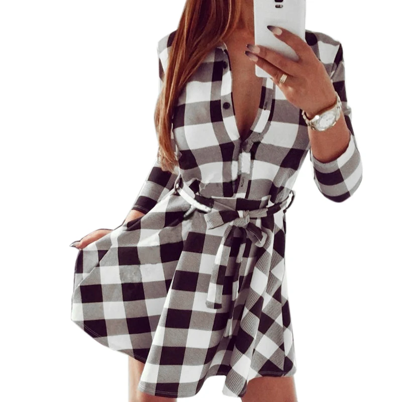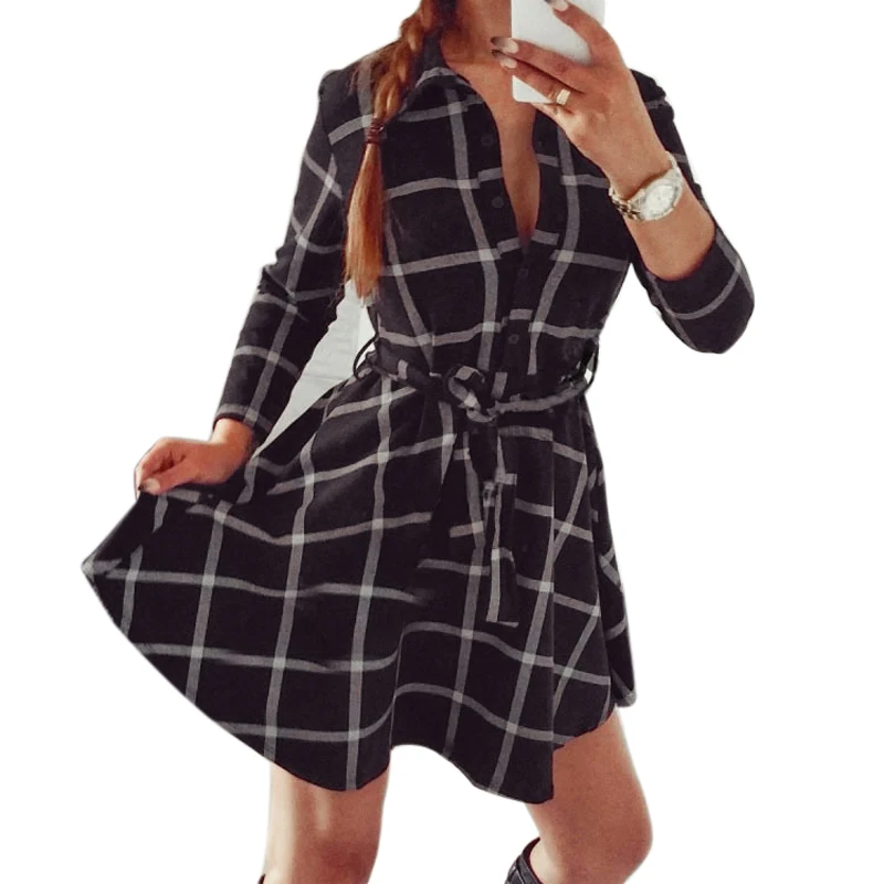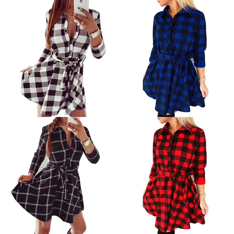 Women Blouses Dress Plaid Turn Down Collar Spring Summer Dress Long Sleeve Casual Fashion Mini Dress