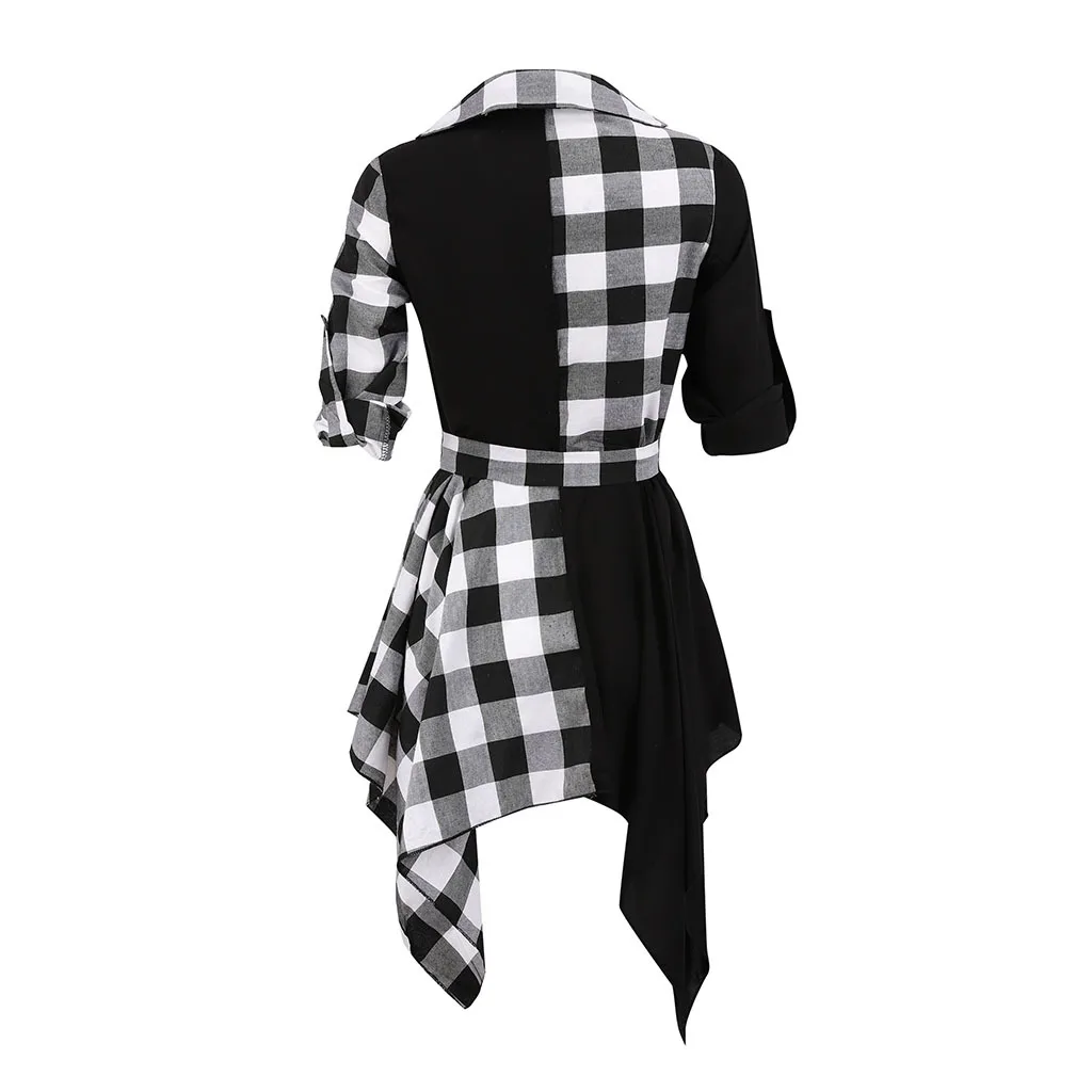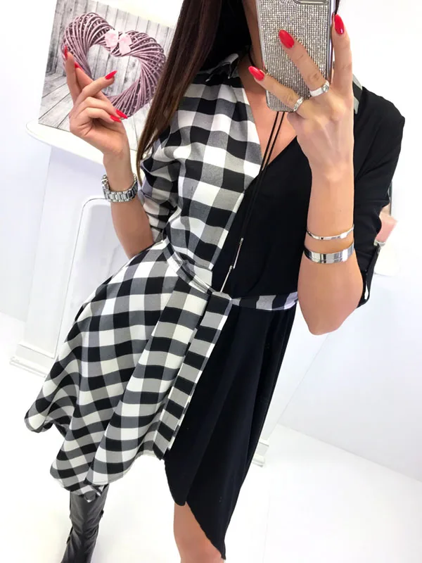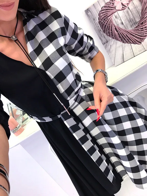 V-Neck Check Dress Long Sleeve Blouse Plaid Tops Sexy Mini Dress