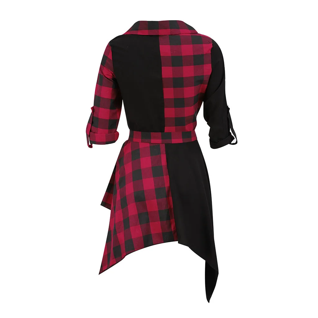 Womens V-Neck Check Dress Long Sleeve Blouse Plaid Tops Sexy Mini Dress